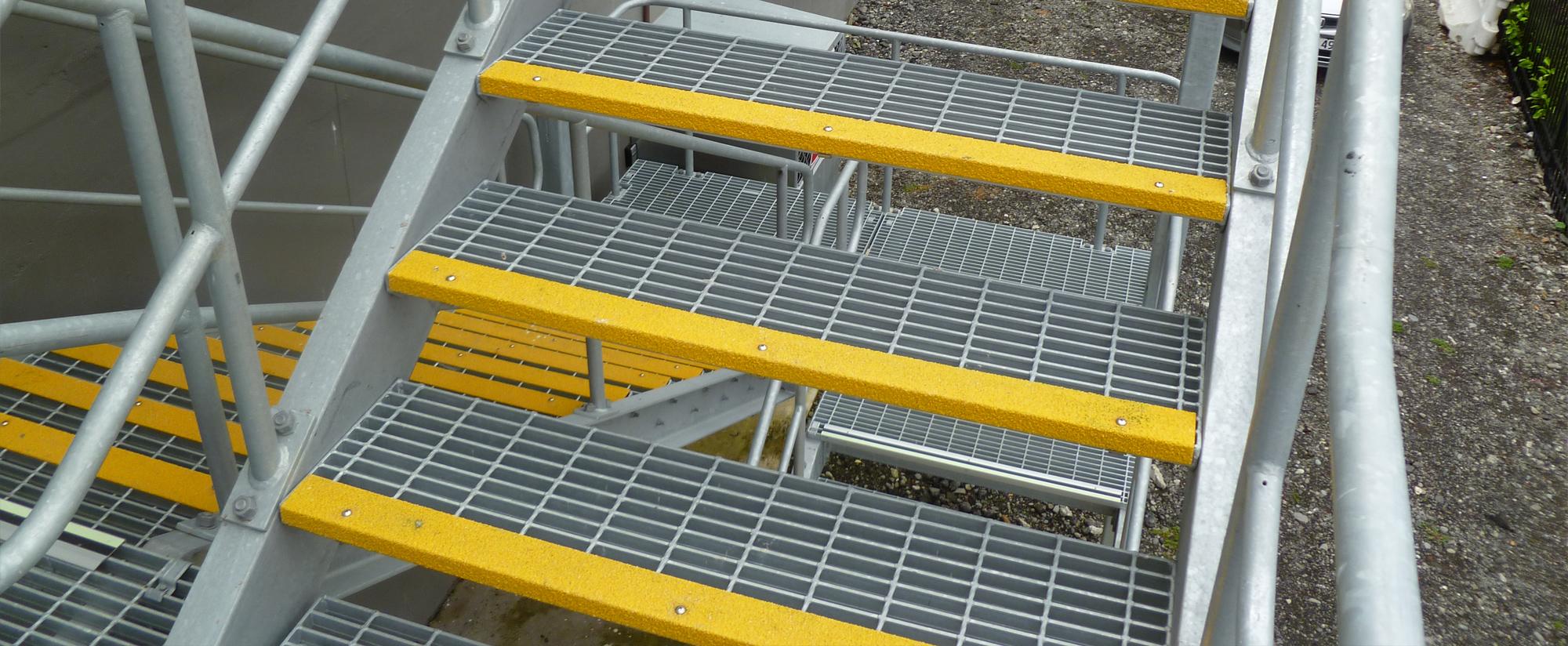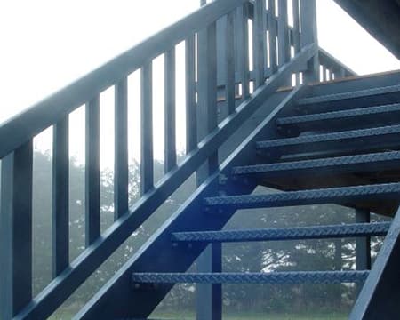 Stair treads are available in steel, FRP, and aluminium